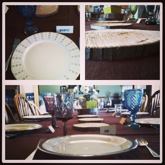 Paired with some assorted stemware and glasses, they (and a couple more plates I already had) created a great Father's Day tablescape. We kept it really simple (because our guys aren't into fancy and floral, etc.) - just added some slices of wood for hot pads down the center of the table.